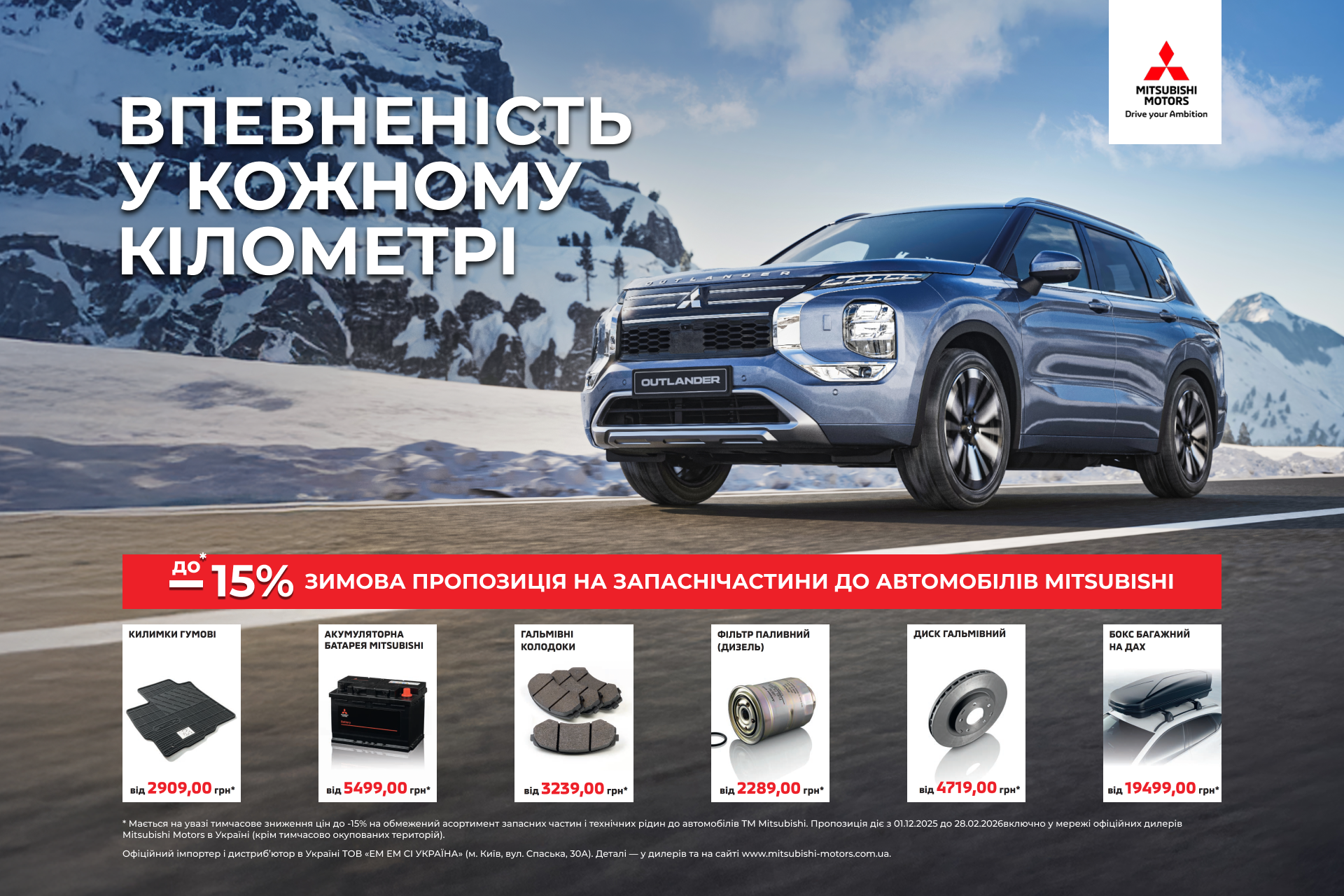 * Мається на увазі встановлення спеціальних цін на обмежений асортимент запасних частин і технічних рідин до автомобілів ТМ «Mitsubishi» (акційні товари). Пропозиція діє з 01.12.2025 р. до 28.02.2026 р. включно у мережі офіційних дилерів Mitsubishi Motors в Україні (крім тимчасово окупованих територій). Деталі співвідношення розміру вигоди до попередньої ціни реалізації, перелік акційних товарів та інші умови дізнайтесь на сайті mitsubishi-motors.com.ua та у консультантів дилерів.